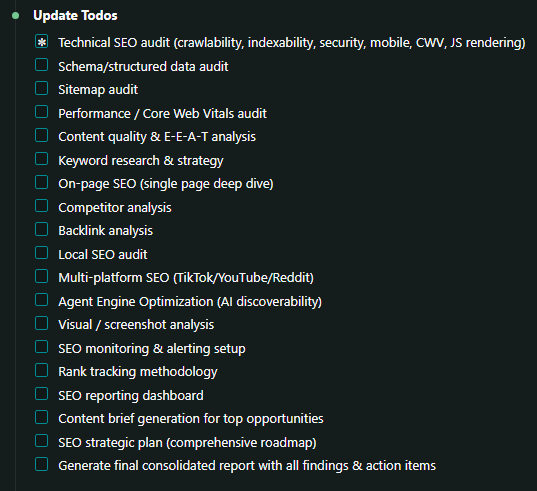 cp -r agents/seo* ~/.claude/agents/curl -sSL https://raw.githubusercontent.com/leofankm/claude-seo-skill/main/install.sh | bashRunning /seo audit — Claude automatically creates and executes 18 audit tasks covering technical SEO, Schema, Sitemap, Core Web Vitals, content quality, and more.