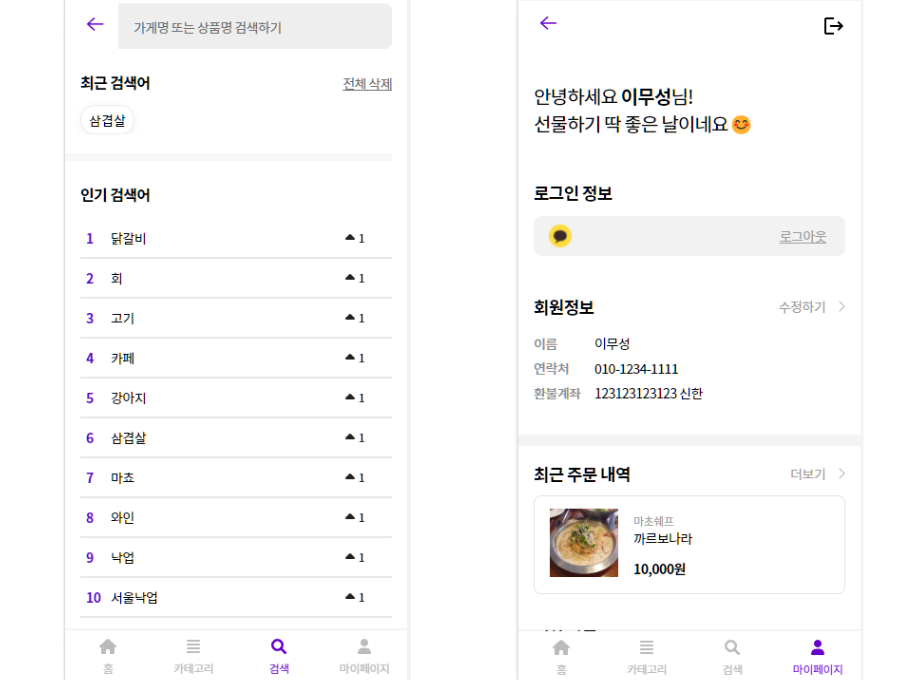 키워드를 통해가게 검색이 가능하다 마이페이지에서정보 수정이 가능하다최근 주문 내역,찜한 상품,취소/환불내역을 볼 수 있다.