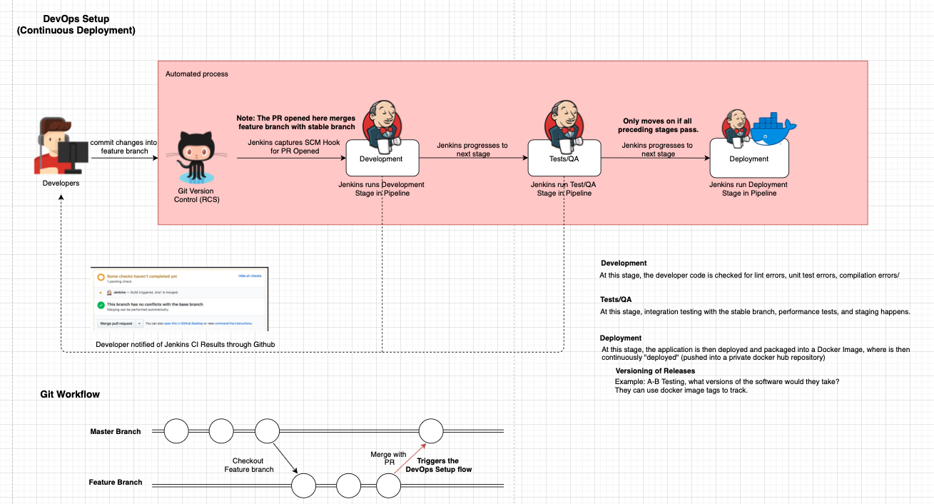 Image of Workflow The above image shows our team's devops setup. As you'll see, the red sections are automated to faciliate a swift and sound development-to-final product process. A full explaination can be found in the assignment report.
