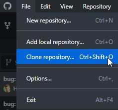 Now we'll want to clone the repository we just forked, click on "File" and then "Clone repository..."