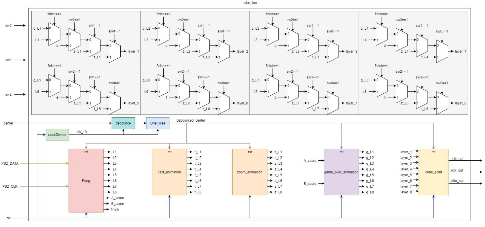Pong is a video game developed by Atari in 1972. The game Atari developed was a sports game that simulates table tennis. The player controls an in-game paddle by moving it vertically across the left or right side of the screen. They can compete against another player controlling a second paddle on the opposing side. We made a pong game in 3D. In this game, instead of just trying to protect one 1D line, players must protect a 2D surface. Also, the paddles will become 2D, so the player will have to move in four directions: up, down, left, and right. But how do we make the game 3D? Since using VR is too difficult and expensive, we came up an idea of using led cube. We plan to let one player stand at one side and the other stand at the opposite side, add they can both play fantastic 3D game in real world. Also, we implement a simple function and let the player can also compete with our machine.
