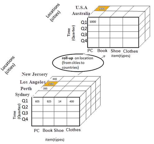 Roll-up is also known as "consolidation" or "aggregation." The Roll-up operation can be performed in 2 ways: