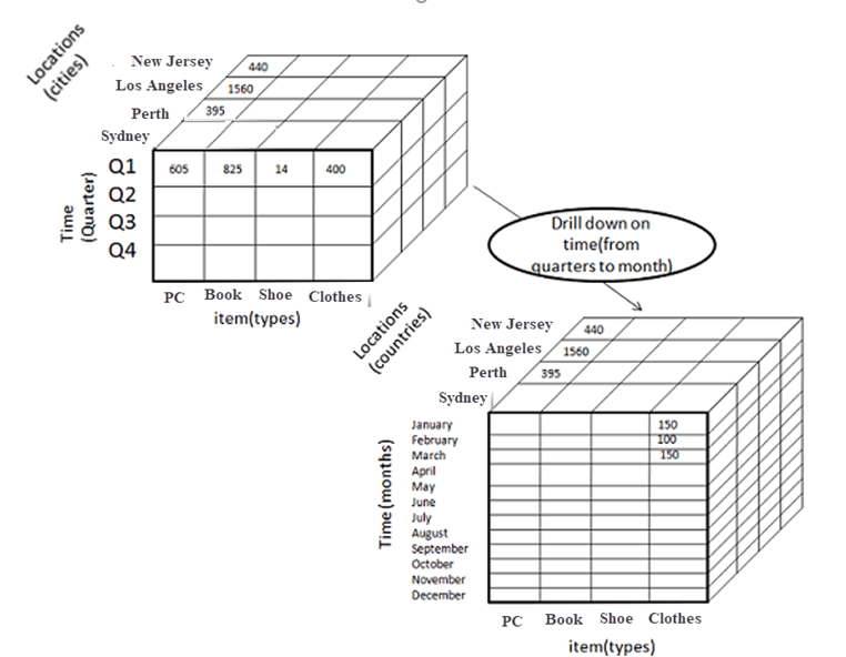 In drill-down data is fragmented into smaller parts. It is the opposite of the rollup process. It can be done via