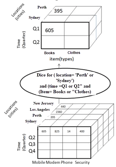 This operation is similar to a slice. The difference in dice is you select 2 or more dimensions that result in the creation of a sub-cube.