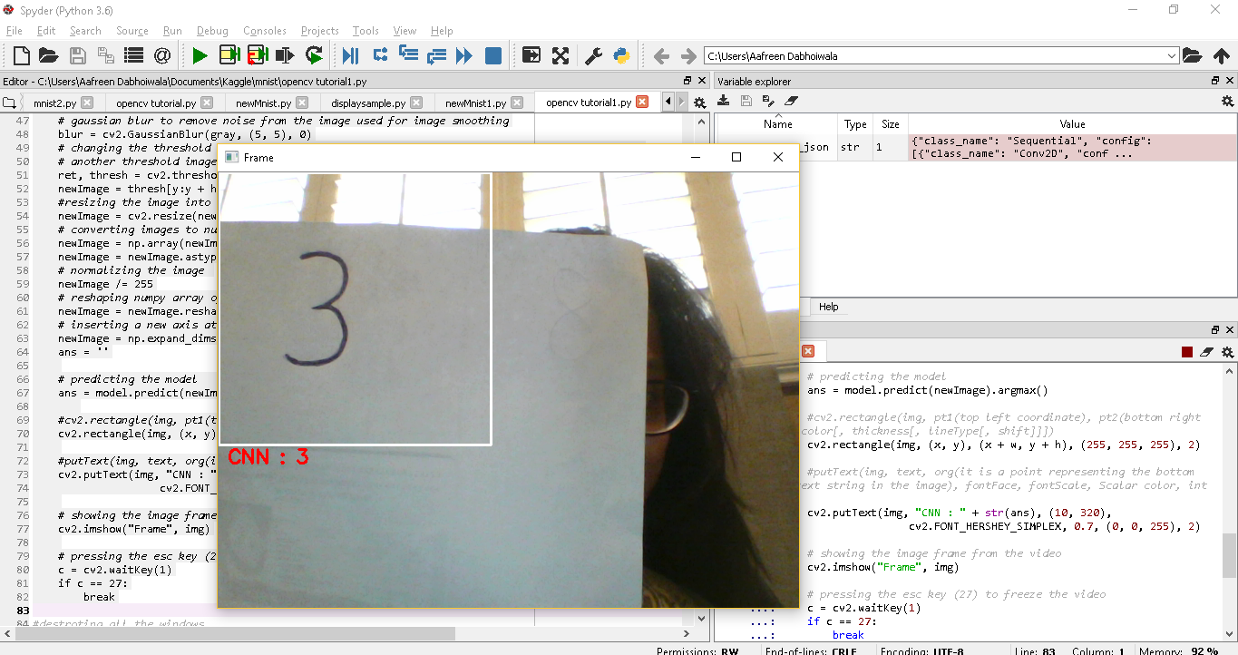 This file loads model from JSON. It is then compiled. Images are captured frame by frame from an active webcam. Captured image frames are passed through image processing. First, it is converted to GrayScale. Second, it is processed using GaussianBlur of OpenCV to remove unwanted noise from the images. Third, Images are converted to threshold images. Fourth- Images are converted into numpy array of images and then they are resized and reshaped into 28*28 shapes. And finally, labels (digit) of array of images from the model are predicted.