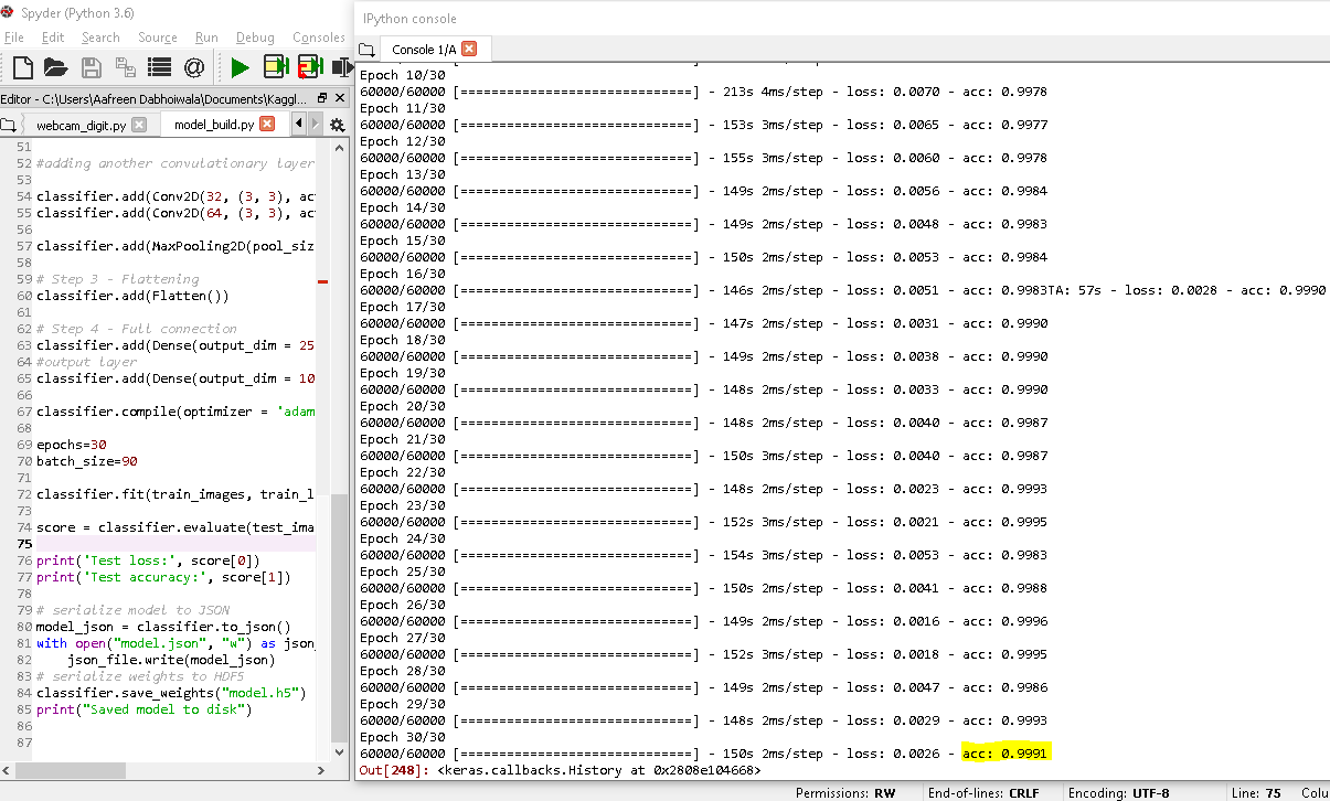 Digit Recognition using OpenCV and Keras in Python with detailed description for beginner with accuracy of 99.91%