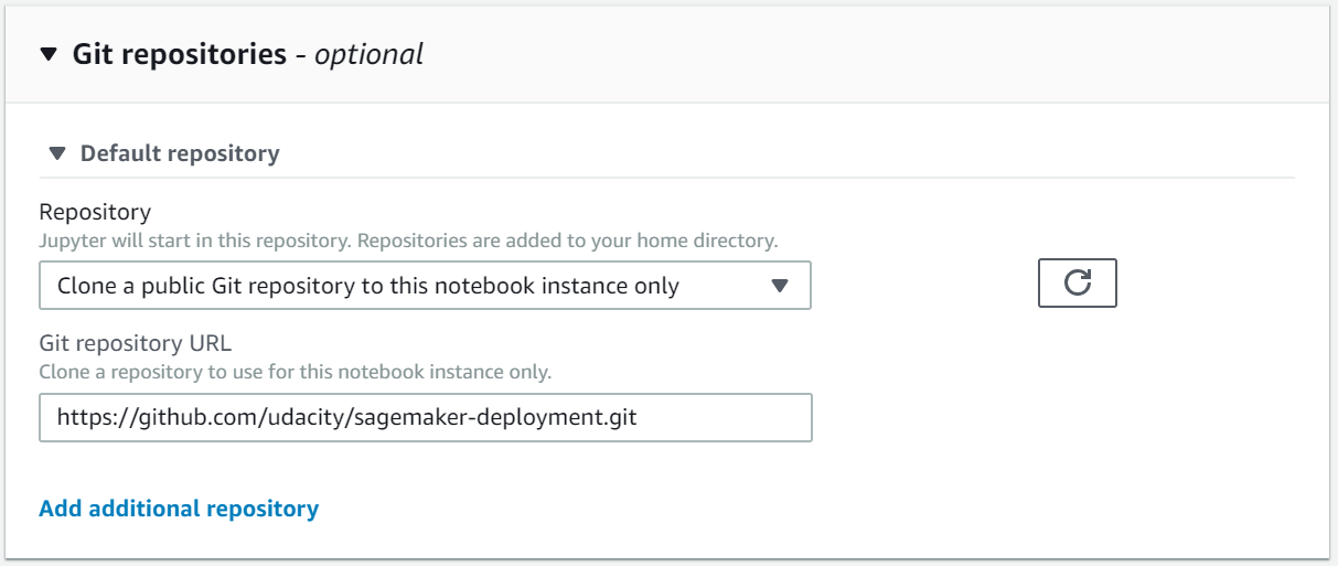 Next, scroll down to the section labelled Git repositories. Here you will clone the https://github.com/udacity/sagemaker-deployment.git repository.
