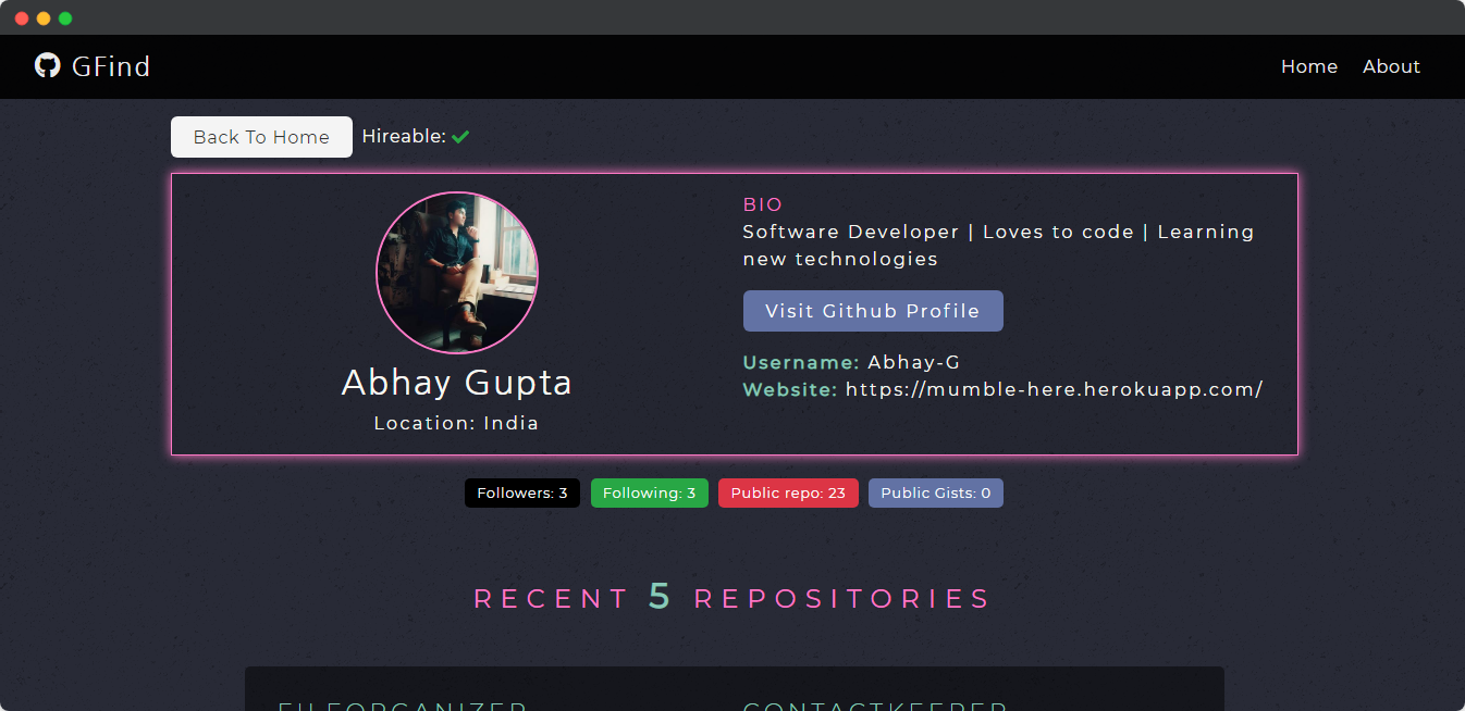 It also gives you brief information about that user profile, which includes name, location, hireable, bio, followers, gists, recent repos, and much more. I made it using React and used Context API for state management and work with Github API for this project.