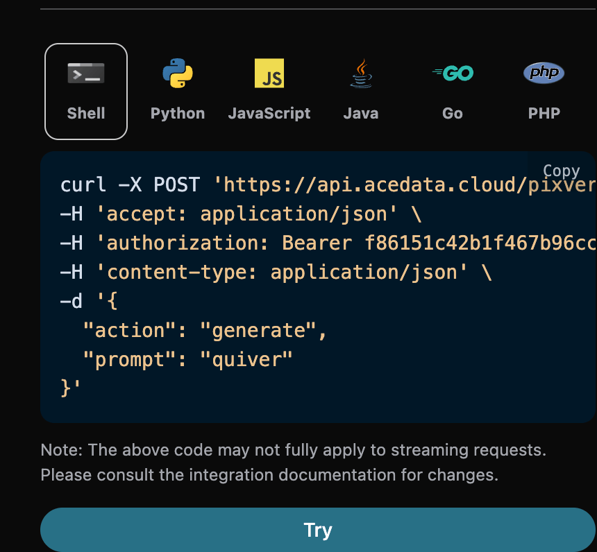 You can click the "Try" button to directly test the API, wait for 1-2 minutes, and the result is as follows: