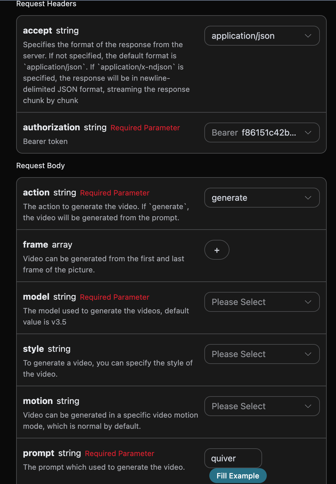 model: The model for generating the video, default isv3.5.action: The action for generating the video, default isgenerate, optionalextend.prompt: The prompt word for generating the video (required).style: Optional video style.motion: Motion mode, default is normal.quality: Video clarity, default is540p.duration: Video duration, 5 or 8 seconds, default is 5.image_url: Reference image for the first frame, optional.aspect_ratio: Aspect ratio, default is16:9.seed: Optional, fixed random seed.template_id: Optional, specify template effects.callback_url: URL for callback results.