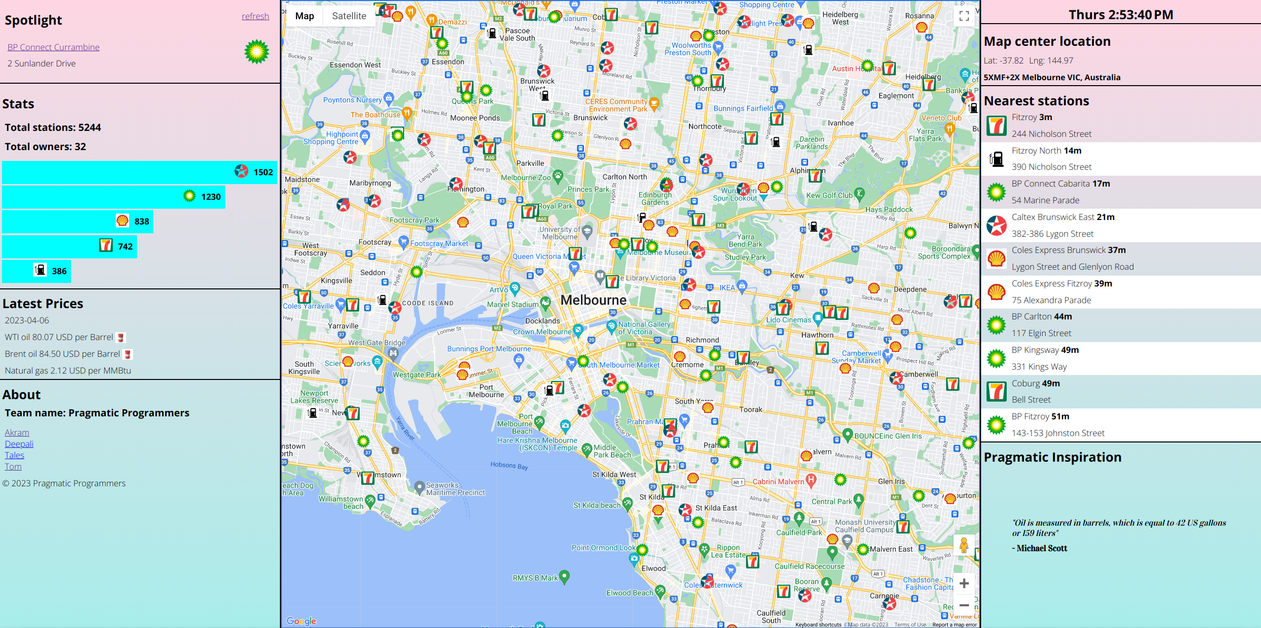 This app utilizes the Google Maps API to visually represent the locations of the petrol stations around Australia as markers, whilst allowing for user interaction with the markers to access further information. Pragmatic Energy also utilizes an in-built REST JSON API to allow for communication between the client side and the server, providing the user a seamless experience with the client as the server-side data is rendered live on the browser.
