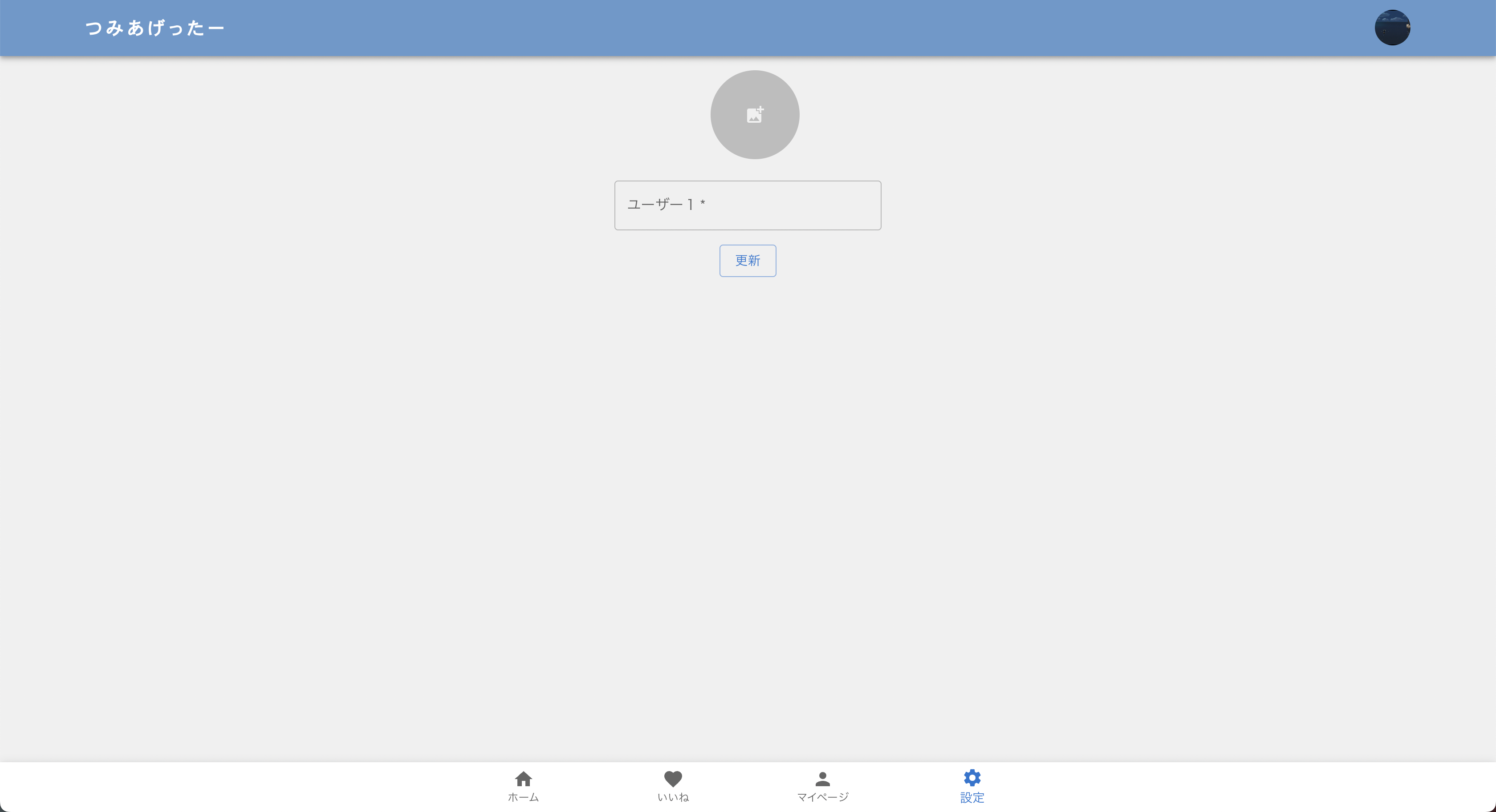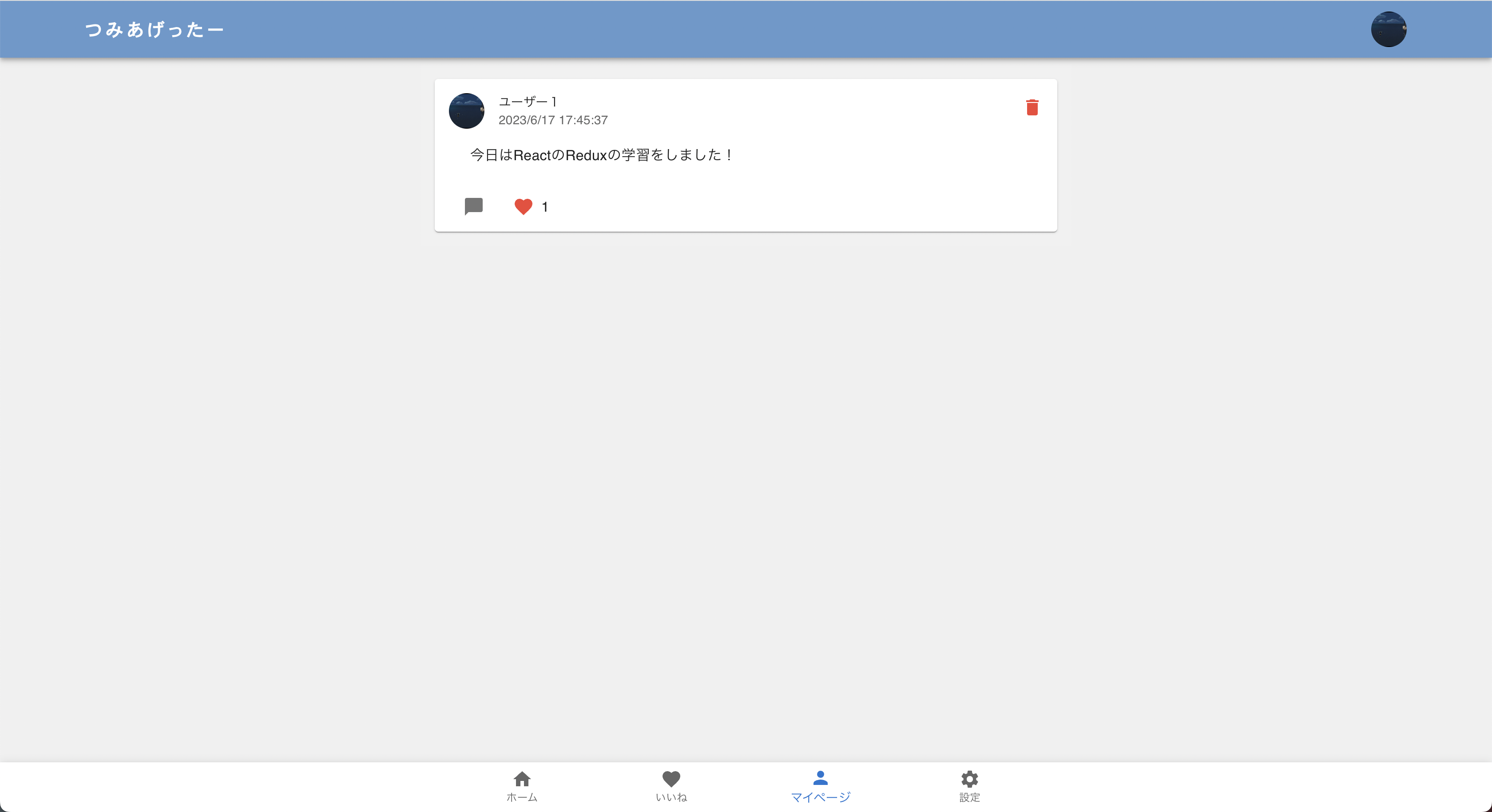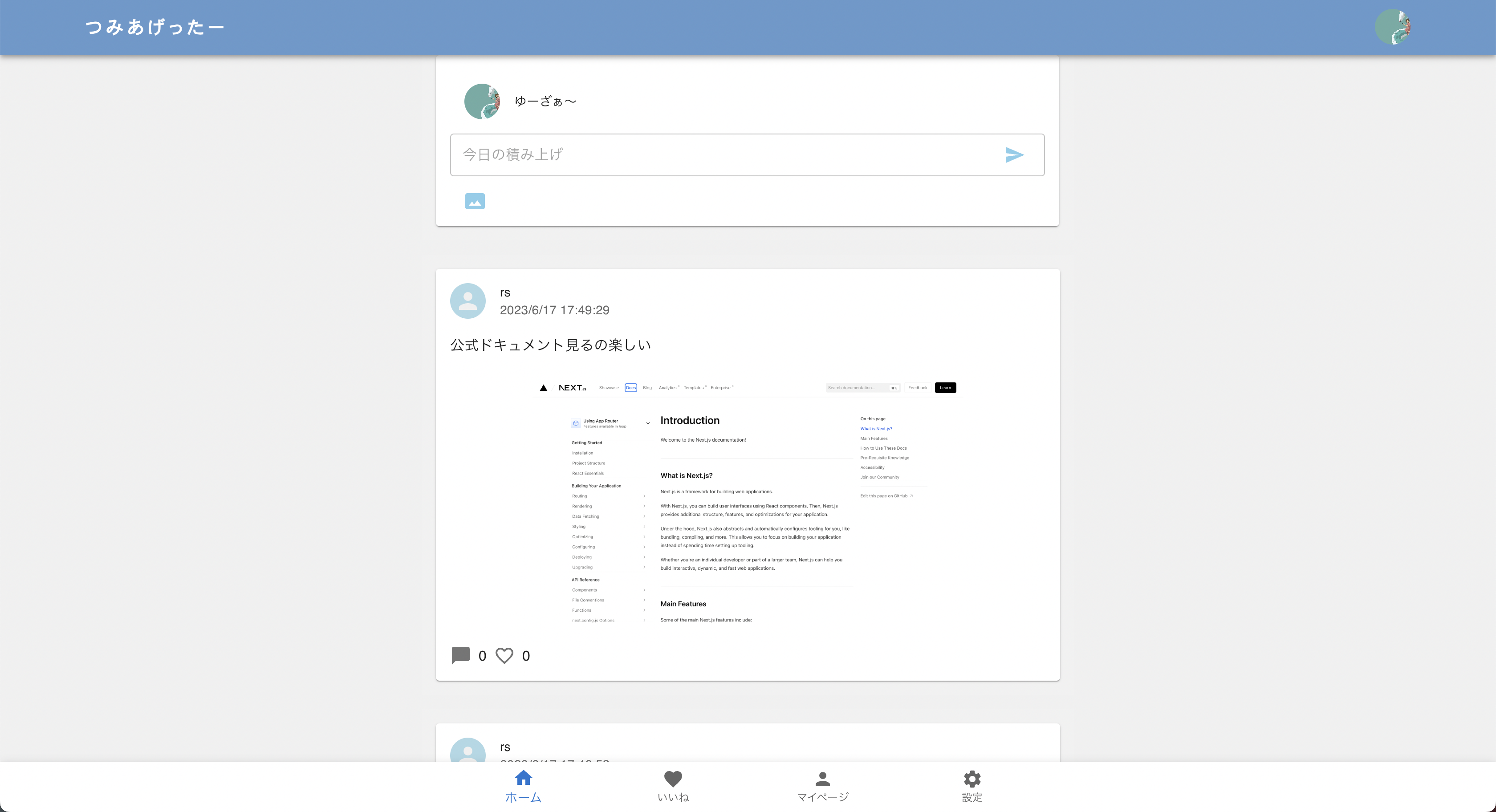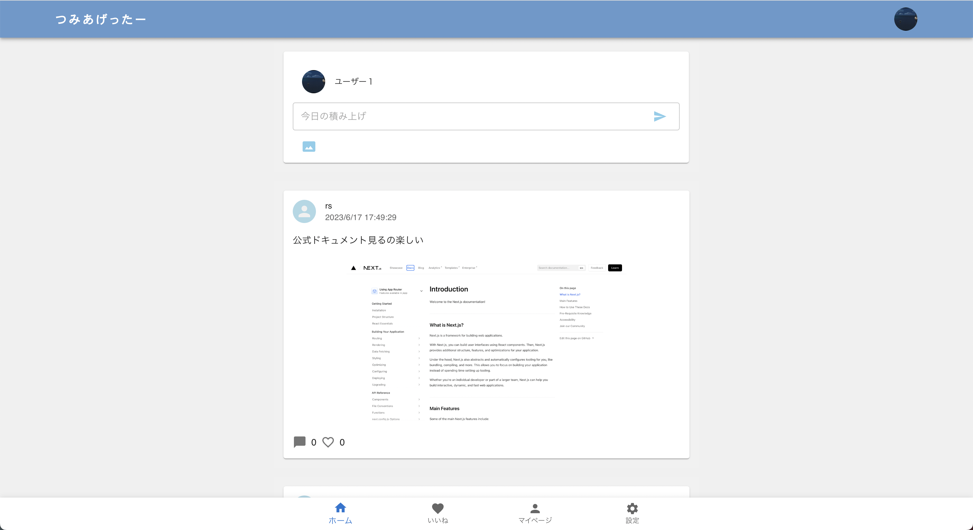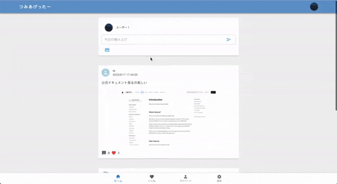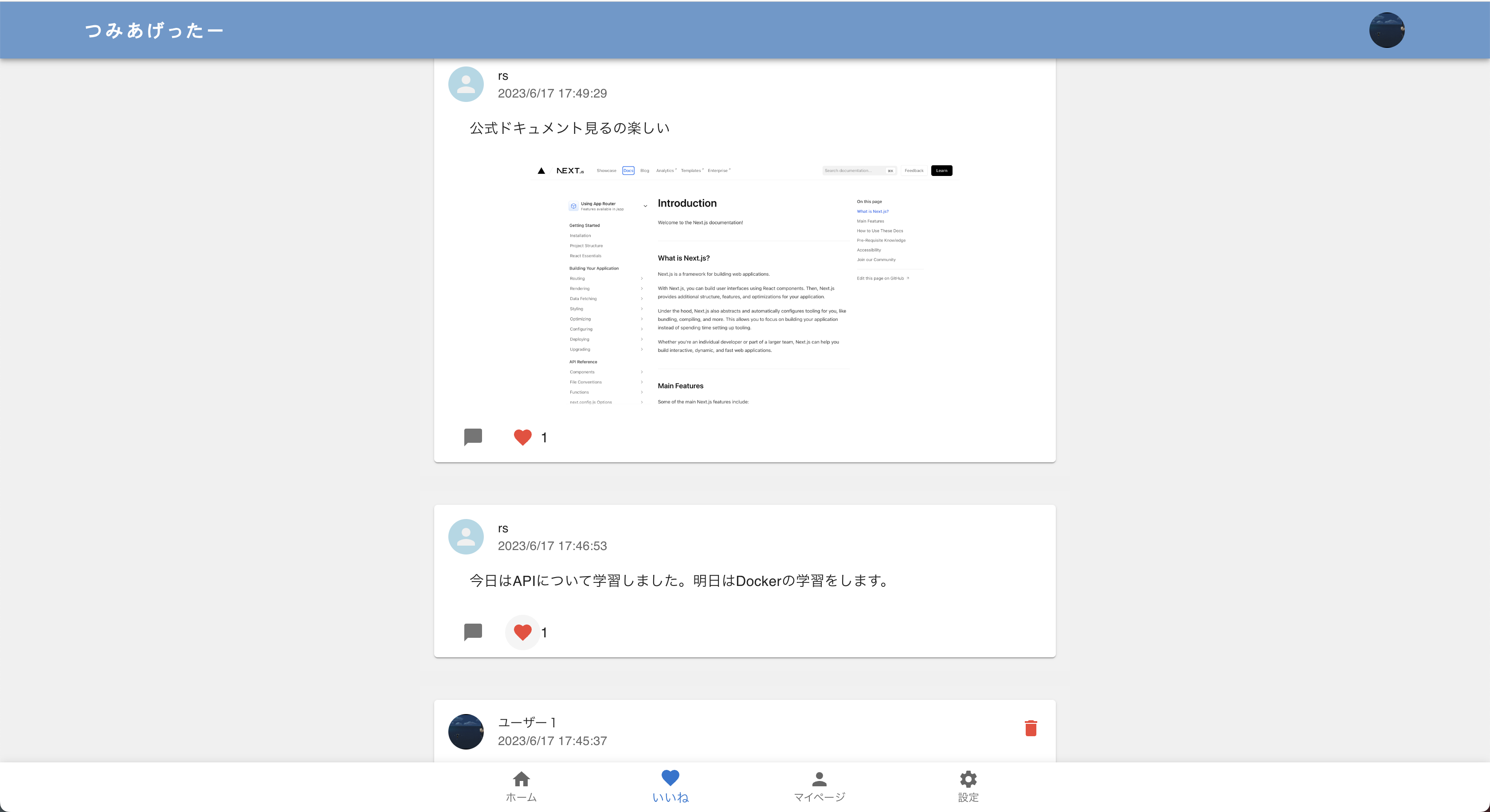 | ホームです。自身の投稿や他のユーザーの投稿が表示されています。 | プロフィールの編集やログアウトができます。 | 過去にいいねした投稿が一覧で表示されています。 |