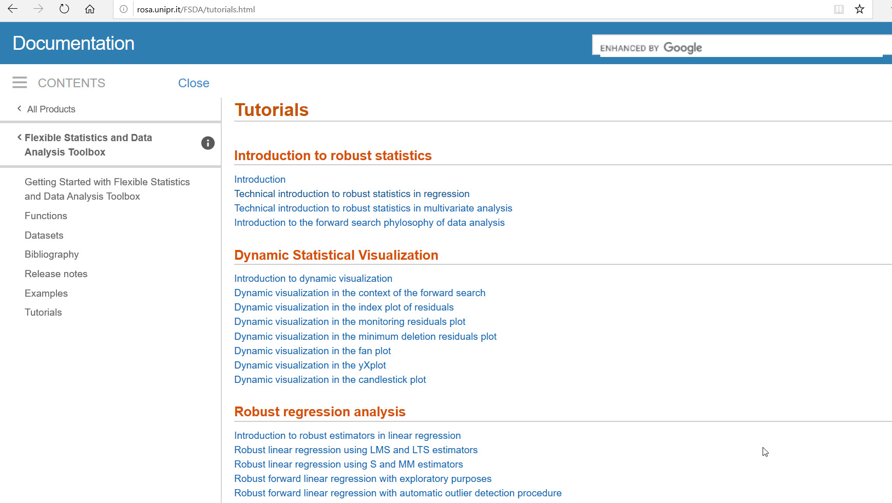 For the details about the functions present in FSDA you can browse the categorial and alphabetical list of functions of the toolbox inside MATLAB (once FSDA is installed) or at the web addresses http://rosa.unipr.it/FSDA/function-cate.html and http://rosa.unipr.it/FSDA/function-alpha.html