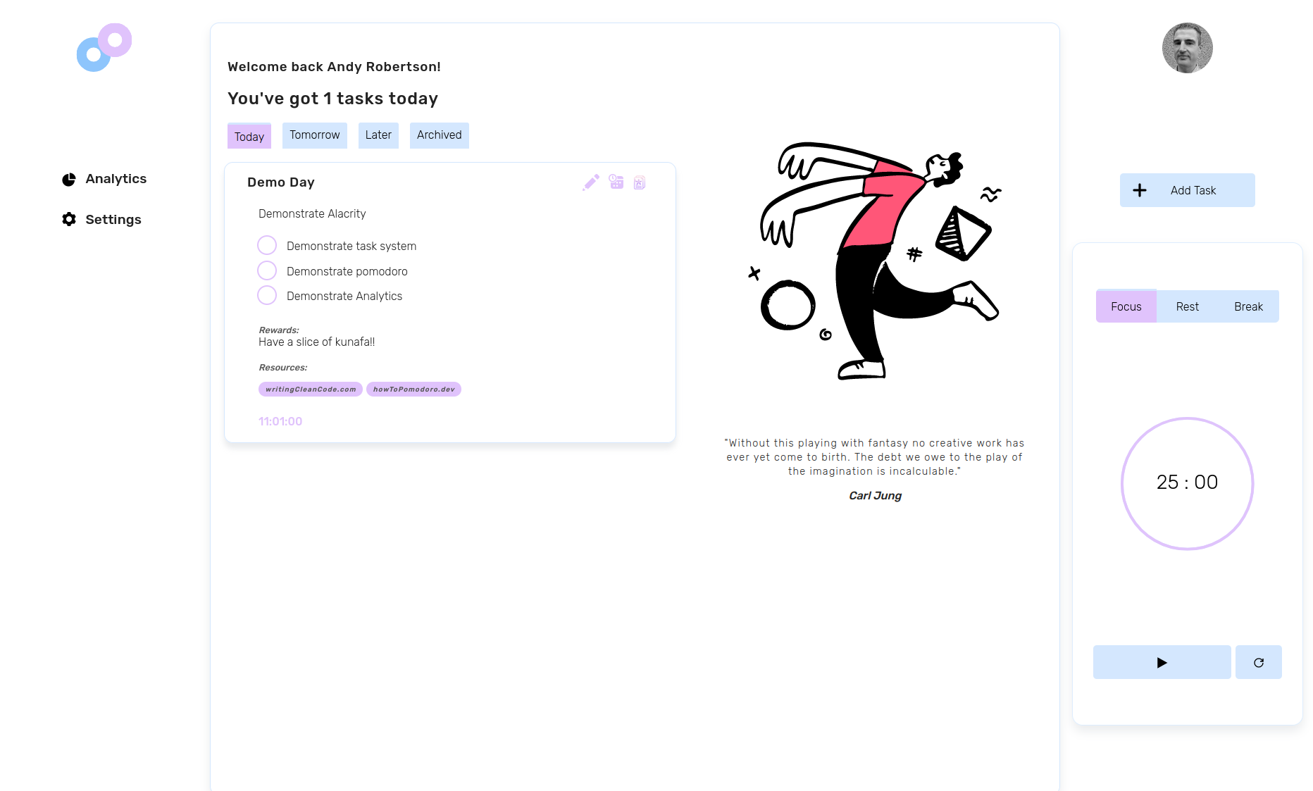When was the last time you wanted to do something but did not get around to it, that's why we built Alacrity, Alacrity is an app that allows users to track tasks and manage their time effectively to help combat procrastination. This project was developed as the final project for CYF developer course.