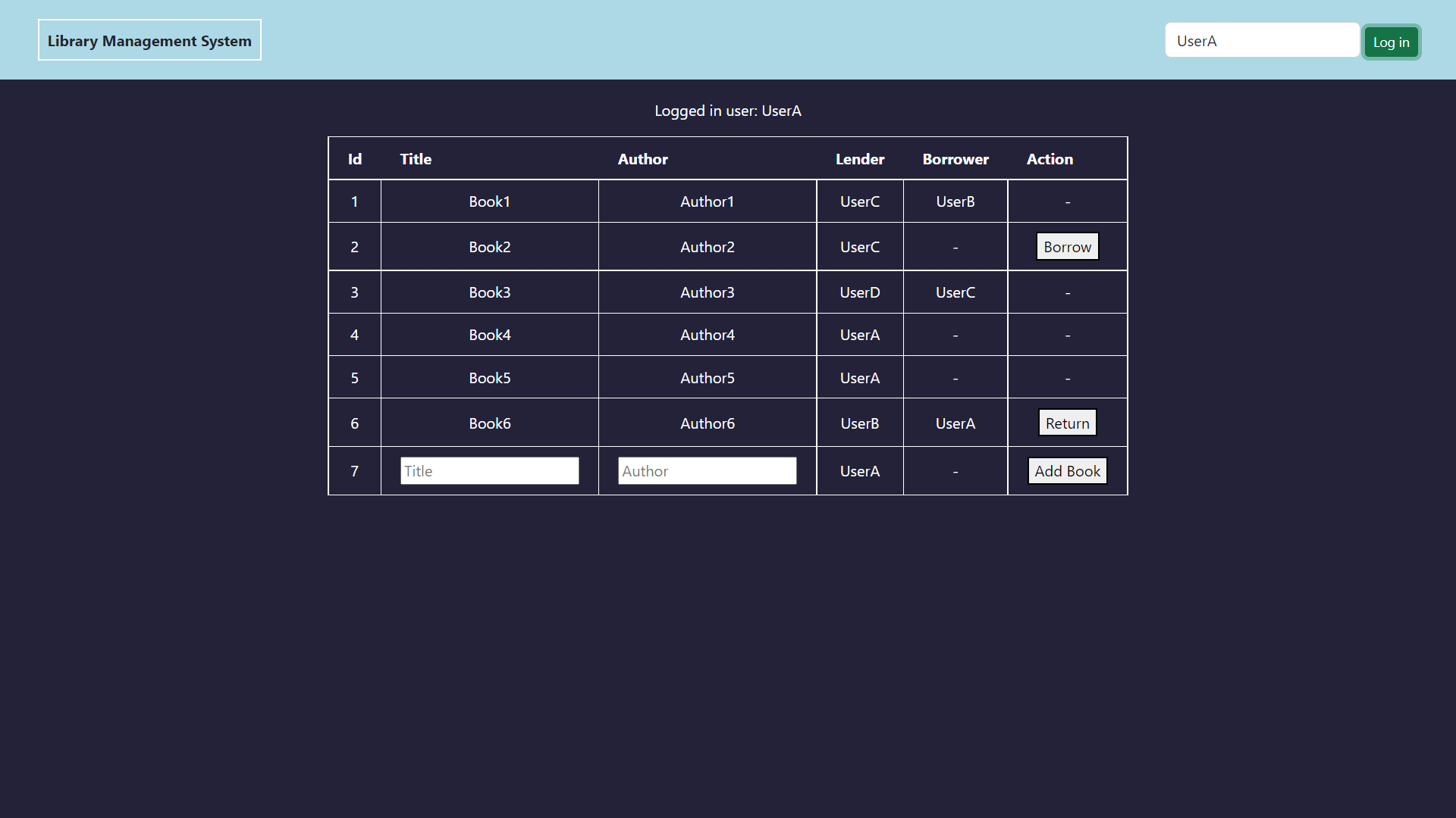 - When clicked, the borrower’s name is removed from the field and it becomes blank, and button changes from "Return" to "Borrow"