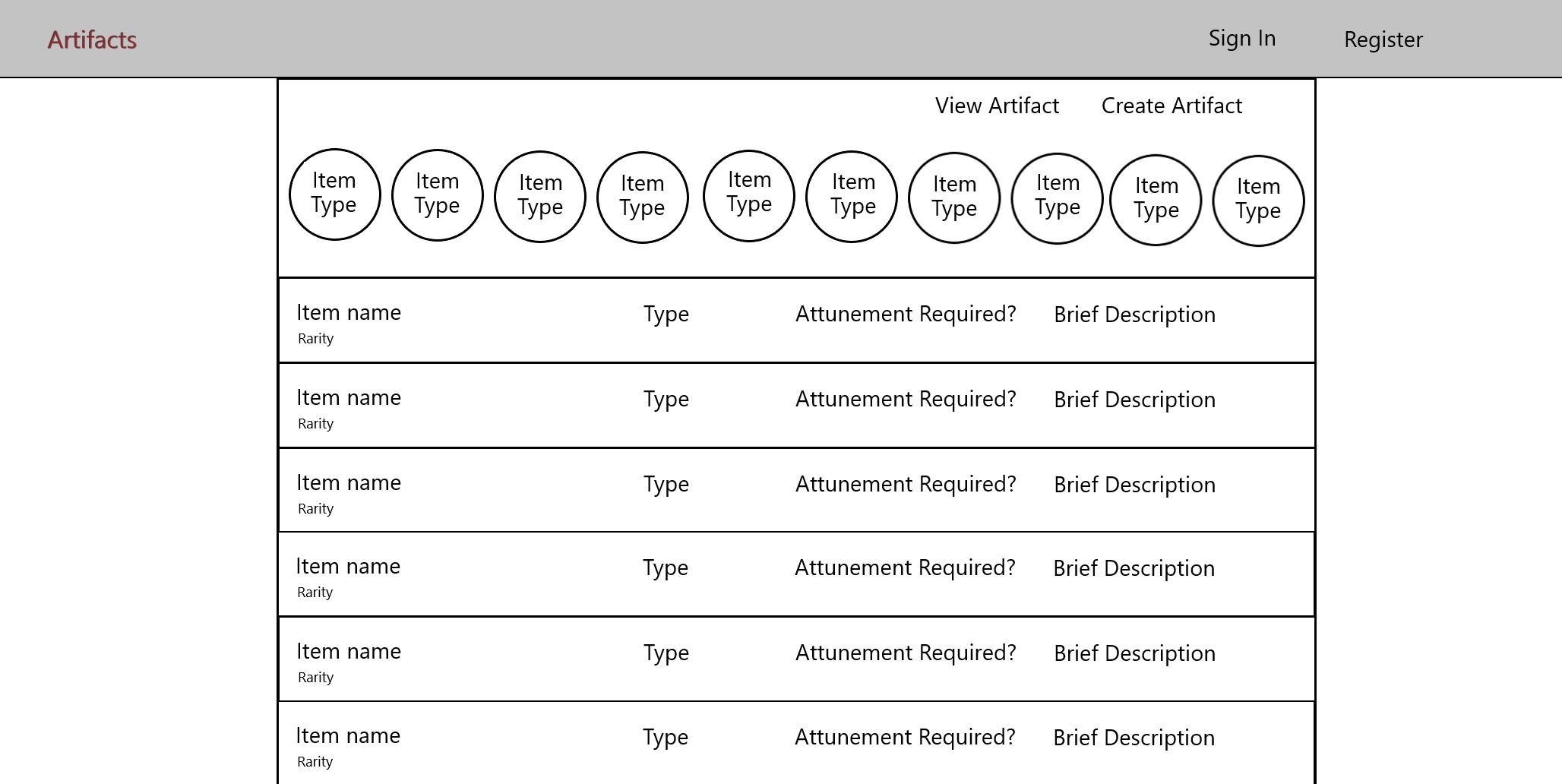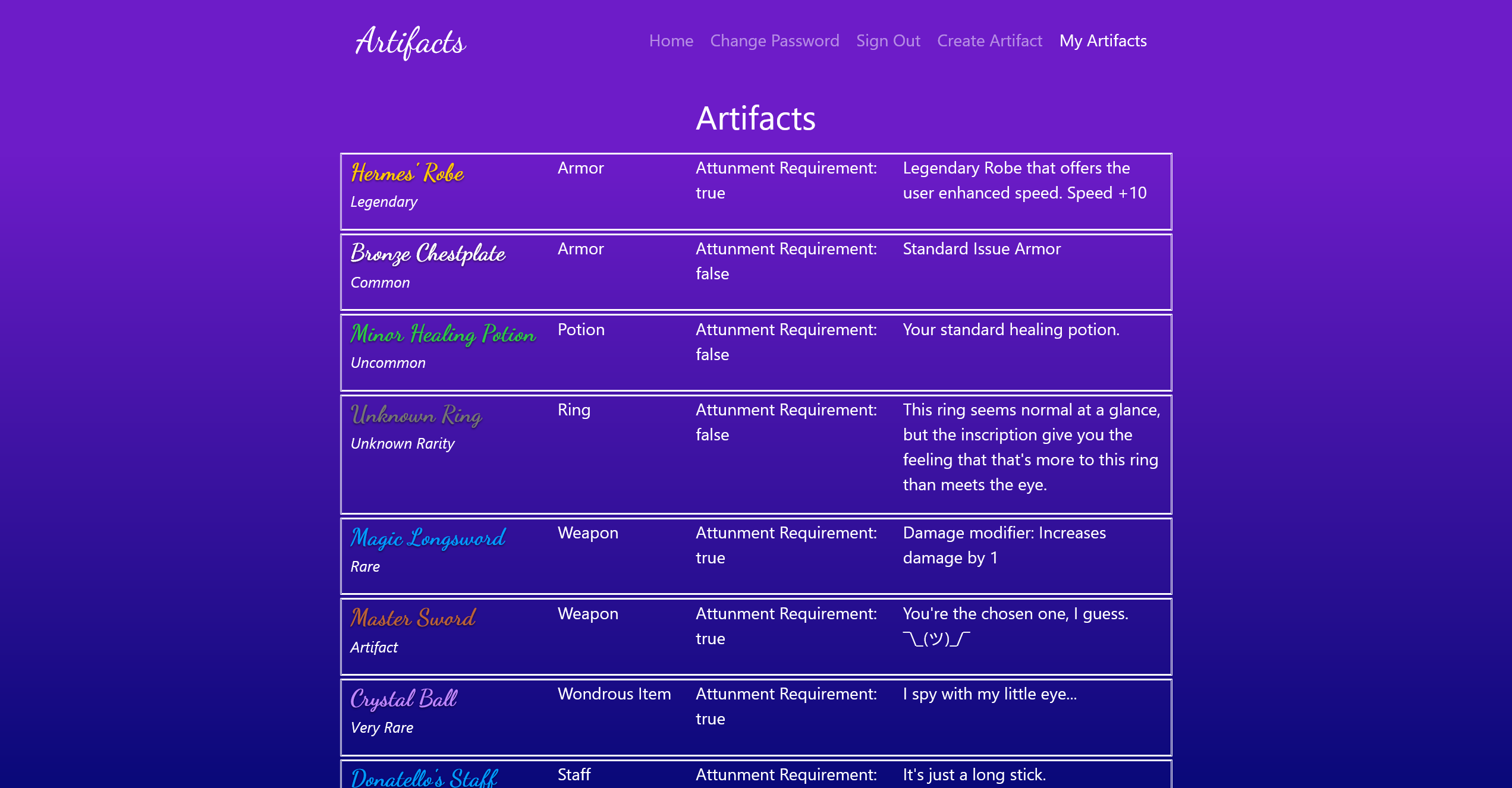 Following my character archive project, I decided to make a similar project for artifacts the characters can wield. I intend to make it similar to D&D Beyond's website, but it's obviously going to take a bit more than V1.