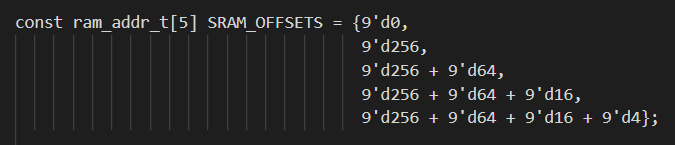 const ram_addr_t[5] SRAM_OFFSETS = {9'd0, 9'd256, 9'd256 + 9'd64, 9'd256 + 9'd64 + 9'd16, 9'd256 + 9'd64 + 9'd16 + 9'd4};