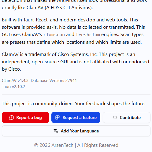 ArsenTech's ClamAV GUI is built with Tauri + React + Typescript and runs on: