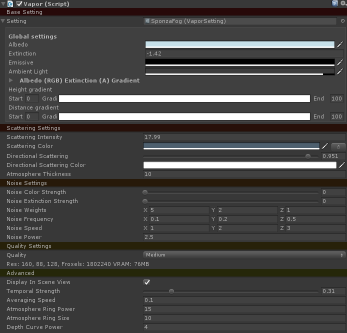The Vapor preset system is also used for lerping between different settings. Every vapor component stores two settings: vapor.Setting and vapor.BlendToSetting. Settings are lerped between these two using vapor.BlendTime. If you need zones with different fog settings (eg. when you have different fog settings a cave or the inside of a house) it is recommended to use this scripting approach if possible as opposed to Vapor Zones as zones occur an additional overhead.