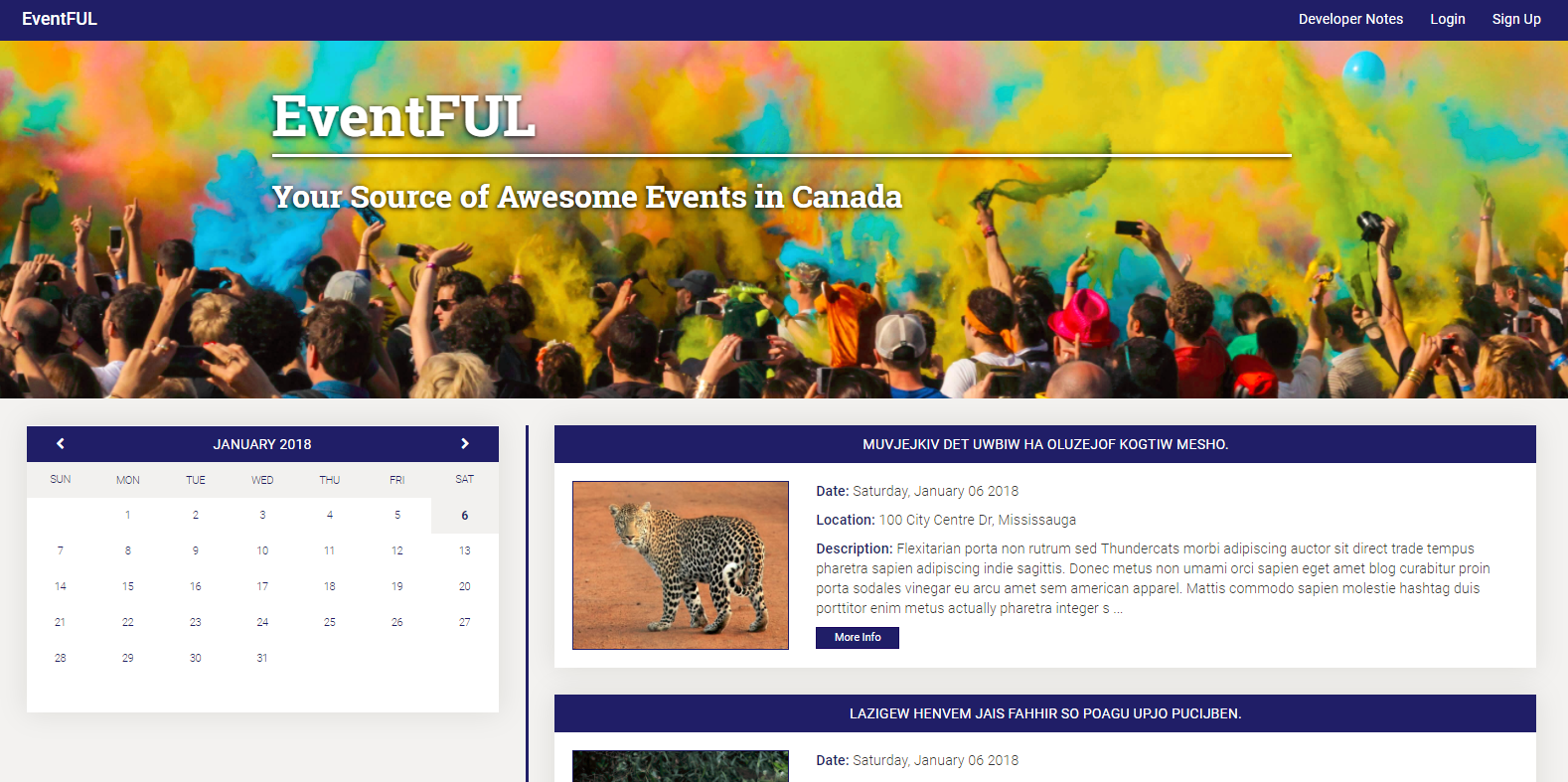 The main challenge was creating random valid Canadian Addresses. Although I could use random text for event title, description, url etc. (see faker) , I needed to use actual canadian addresses (in order for the google Maps functionality to work). Hence I had to write a script that uses google places API to generate random valid canadian addresses.
