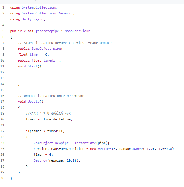 generatepipe.cs 장애물인 파이프를 생성하는 코드입니다. 랜덤으로 y값을 바꾸어서 생성되도록 만들었고, 시간이 지나면 destroy함수를 통해서 시간이 지나면 자동으로 사라지게 만들었고 효과음을 넣어서 파이프를 통과할 경우 소리가 나게 만들었습니다.