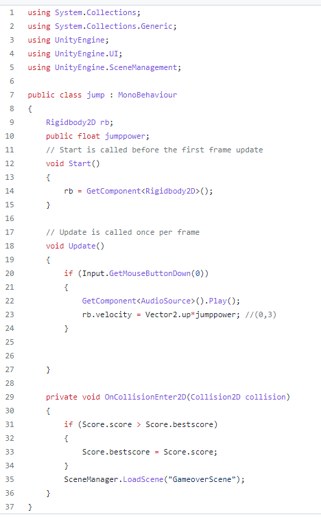 jump.cs 캐릭터인 방울이가 점프하게 만드는 코드입니다. 터치할 때 마다 점프하도록 만들었고, 충돌판정을 넣어서 부딪힐 경우 게임 오버 씬으로 전환되도록 만들었습니다. 효과음을 주어서 점프할 때마다 소리가 나도록 만들었습니다.