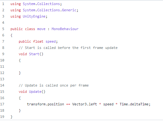 Code to adjust the speed of the move.cs game. I made it convenient to adjust the speed in the editor by using the public float. As a result of the feedback, there were many opinions that the current speed was appropriate, so we decided on the current speed.