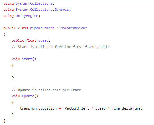 pipemovement.cs Code for pipe, an obstacle, to move to the side, which is the direction of the game, at speed. I made it convenient to adjust the speed in the editor by using the public float. As a result of the feedback, there were many opinions that the current speed was appropriate, so we decided on the current speed.