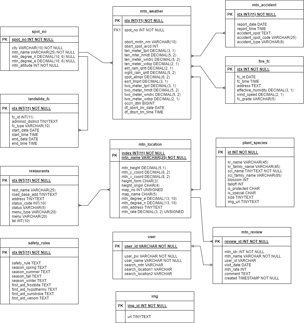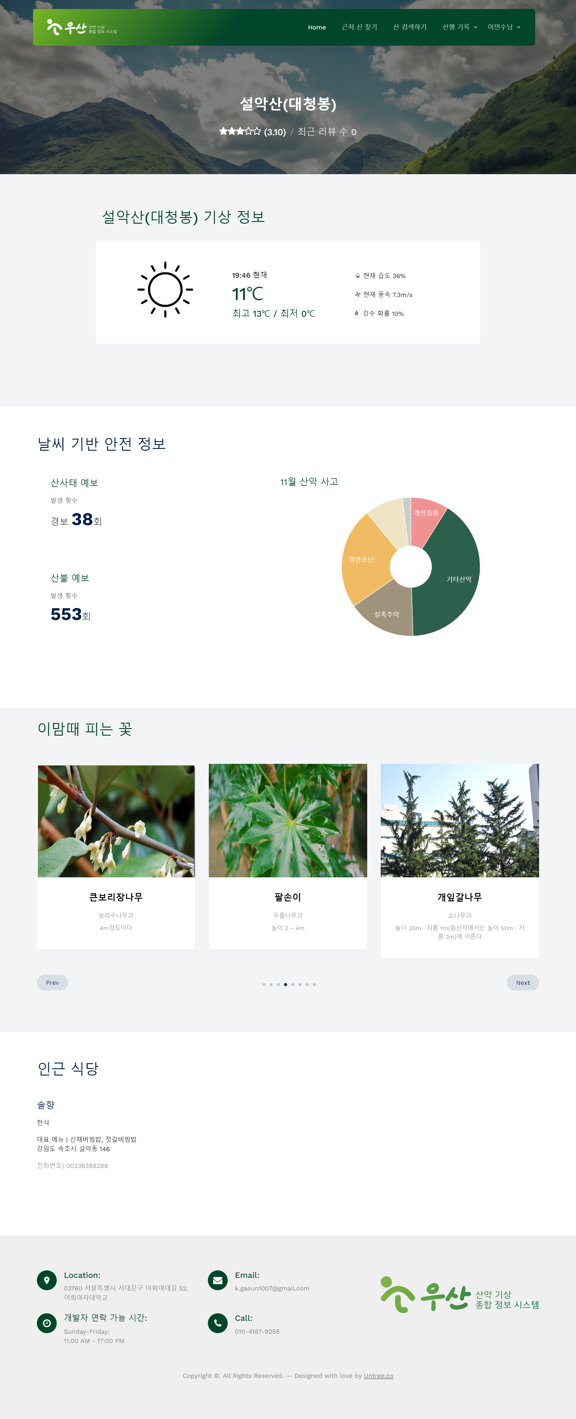 | 김나연 | - [인명재해정보]소방청_전국 산악사고 현황 - [산사태예보발령이력]_산사태예보발령 - (공개용)산높이및위치자료(2019.4.8) (주소 칼럼 편집) - 산림청_표준식물종정보 (이미지 URL 크롤링) |