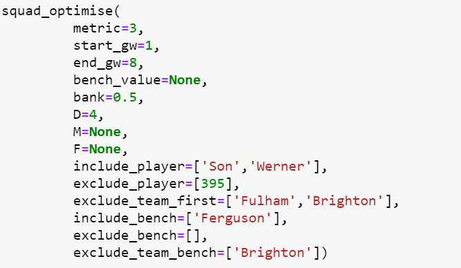 Both 'squad_optimiser.ipynb' and 'squad_optimiser.py' do the same thing. A description of the parameters that can be used in the squad optimiser are outlined in both files and a sample output can be seen below.