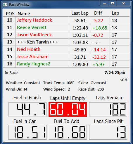 Fuel to Finish: This shows how much fuel is needed to finish the race. It's based on your avg fuel use and laps remaining. Laps Until Empty: This takes your avg fuel calculation and shows you how many laps you have until you run out of fuel. This of course changes if you have caution laps, etc. It's background will change based on if you can finish the race with the current amount of fuel in your tank. Red if you don't have enough, Green if you do. Lap Remain: Simply how many laps remain in the race. Fuel in Car: How much fuel you have in the car. Fuel to Add: This shows you how much fuel you need to add to finish the race. It'll show 0 if you can finish, and it will show the total capacity of your fuel tank if the fuel needed is more than 1 tank of fuel. Laps Since Pit: How many laps it's been since you pitted last.