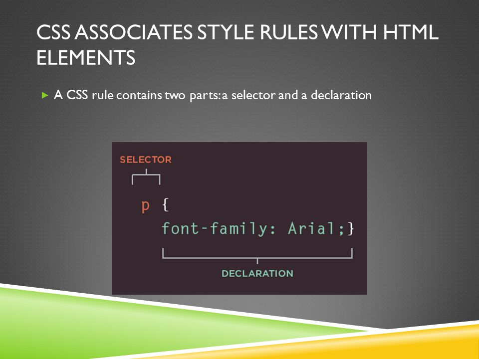 CSS allows you to create rules that specify how the content of an element should appear. For example, you can specify that the background of the page is cream, all paragraphs should appear in gray using the Arial typeface, or that all level one headings should be in a blue italic, Times typeface.