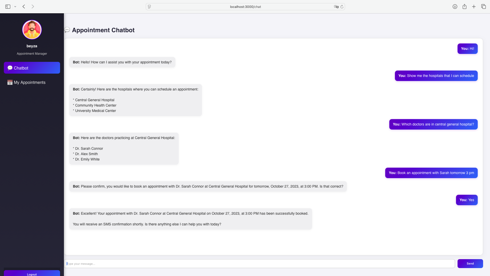 • /chat → enjoy the appointment bot