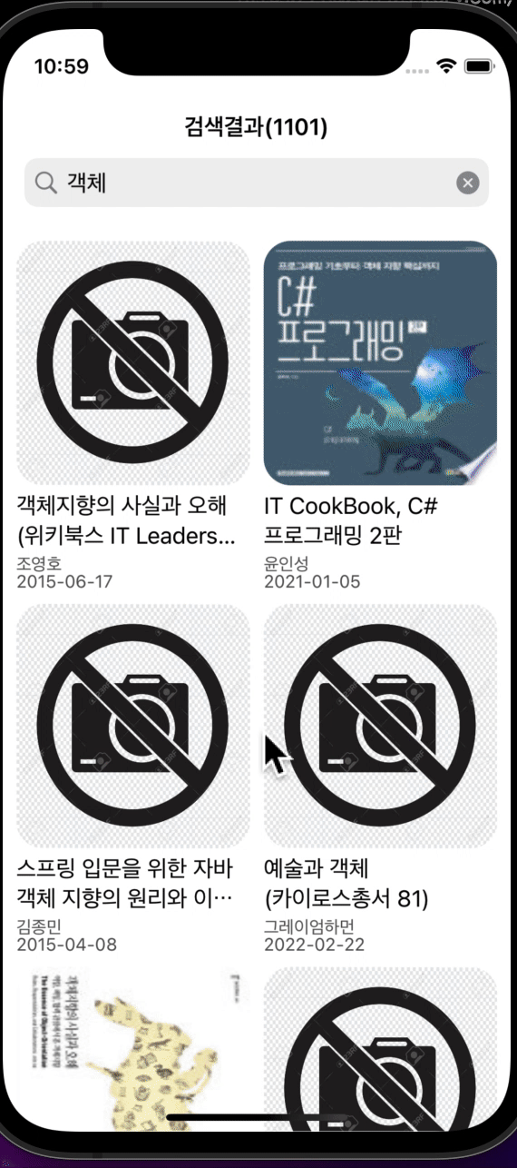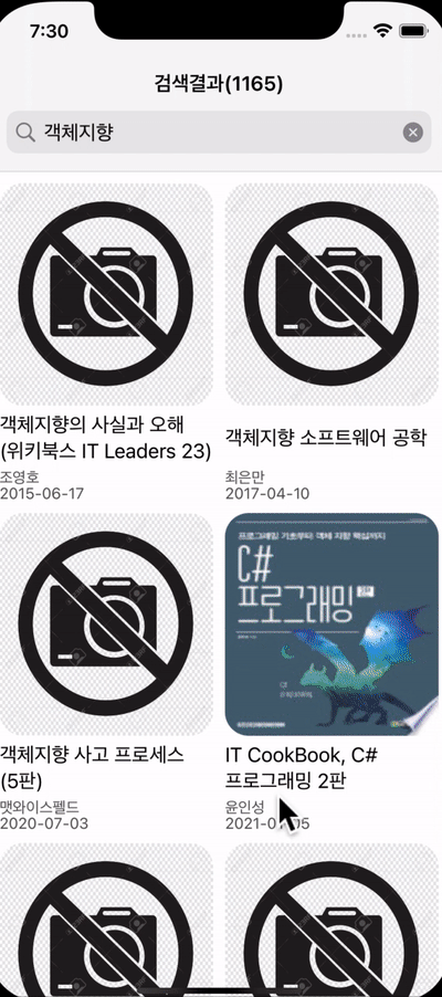 - SearchController를 사용하여 검색기능 사용가능 - 키워드 입력 후 검색을 누르면 GET 메서드로 데이터를 불러옴 - BookList의 item(cell)을 누르면 BookDetailViewController로 이동 - BookDetailViewController 선택된 item의 데이터 전달 |