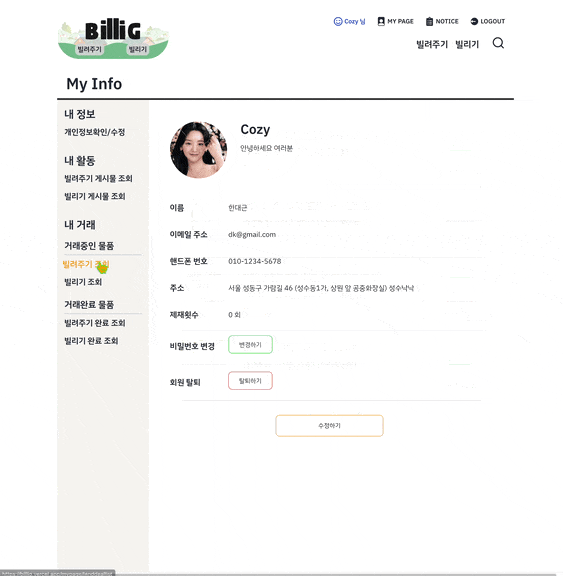 | 내 거래 조회 | 사용자가 대여인/차용인으로 등록되어 있는 글들을 거래 현황에 따라 볼 수 있습니다. |