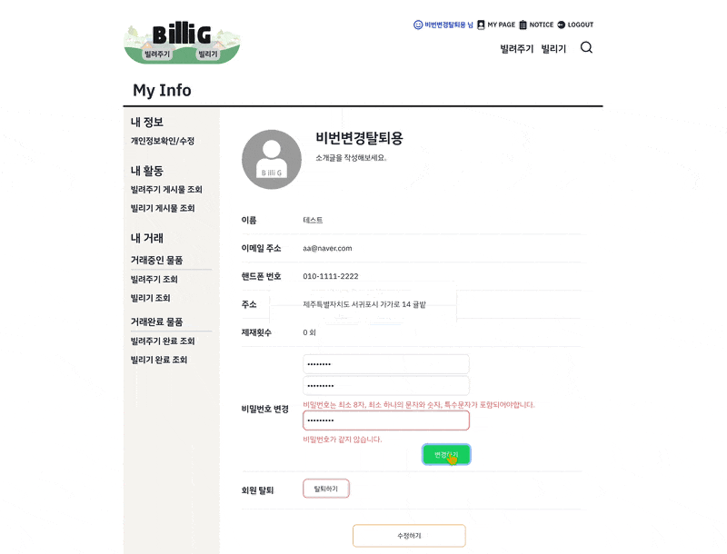 | 비밀번호 변경/탈퇴 | 비밀번호를 수정하고, 탈퇴가 가능합니다. |