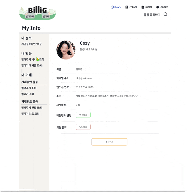 | 개인정보 수정 | 회원 정보를 수정합니다. |