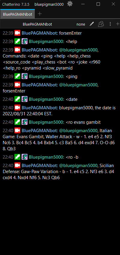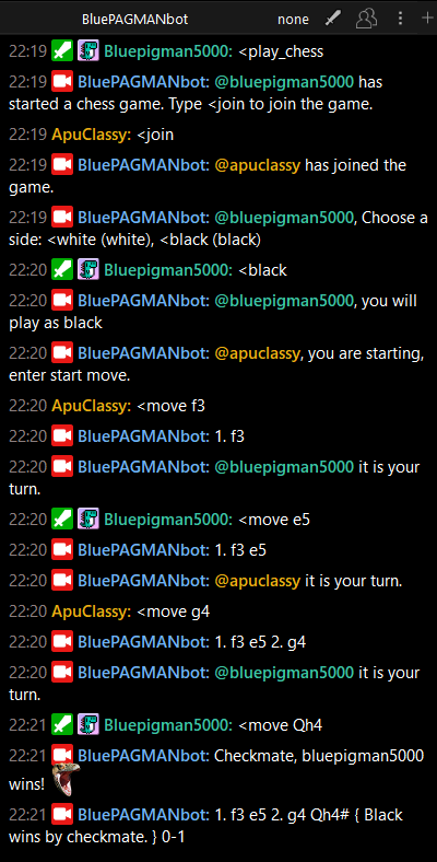 - Play a chess game through sending messages, with a dynamically updated PGN of the ongoing game.