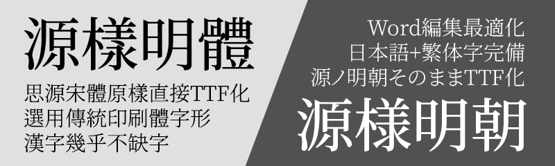 「源樣明體」是基於思源宋體的開放原始碼中文字型。 採用思源宋體韓文(KR)版本的字符,配合繁體中文慣用的置中標點,可排版傳統印刷體風格的文件。