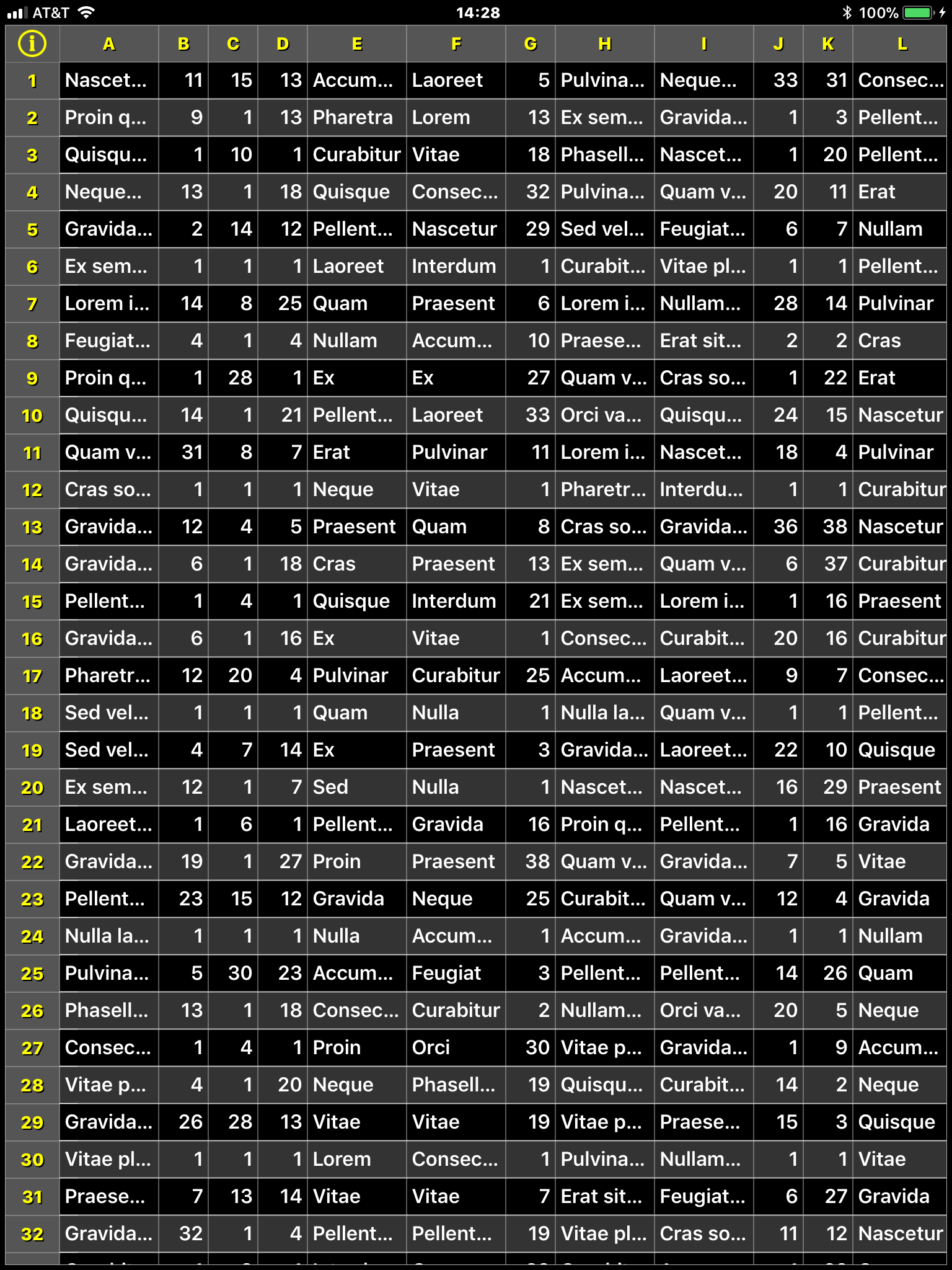 Here is a screenshot from the SpreadsheetViewDemo app on an iPad.