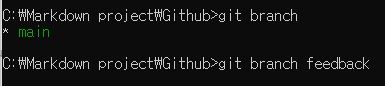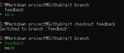 위의 과정에서 feedback의 브런치가 생성된 상태에서, 이 브런치에 수정한 readme파일을 올리기 위해 checkout 명령어를 사용하였다.