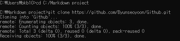 프로젝트의 첫번째 부분을 담당한 팀원이 GitHub의 레파지토리에 자신의 문서를 올린 상태에서 다른 담당한 팀원들이 해당 레파지토리에서 자신의 폴더에 파일을 가져오기 위하여 git clone의 명령어를 사용했다.