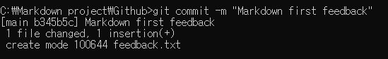 위에서 staging area에 놓여져 있는 feedback.txt파일을 제출하기 위해서 git commit 명령어를 사용하였다.