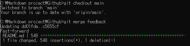 branch를 main으로 이동해준 뒤에, git merge 의 명령을 사용해 feedback 브런치와 결합하였다.
