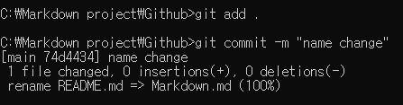 병합한 상태의 README 파일의 이름을 Markdown으로 바꾸기 위해서, 파일 이름을 바꾸고 add와 commit을 해준다.