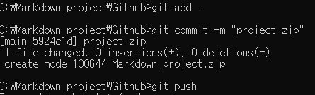 갱신된 파일을 가져와 md 파일을 확인한 다음 더 이상 수정사항이나 변경사항이 없는 상태에서, 이 md파일과 여기서 사용되는 사진들을 zip파일로 합쳐서 레파지스토리에 올리려고 할 때, 앞에서 사용한 명령어인 add, commit, push를 사용하여 zip파일을 레파지스토리에 적용한다.