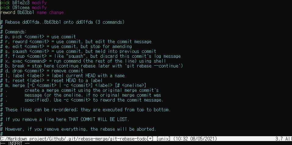 git rebase -i $[수정할 커밋의 직전 커밋] 수정할 직전의 커밋은 '커밋의 해시'를 이용하거나 'HEAD~3'처럼 HEAD를 기준으로 작성이 가능하다. 이 옵션을 사용하게 되면 여러가지 edit 기능이 있는 vim이 나오게 되어 다양한 edit 기능을 선택하여 사용할 수 있다.