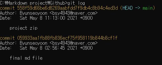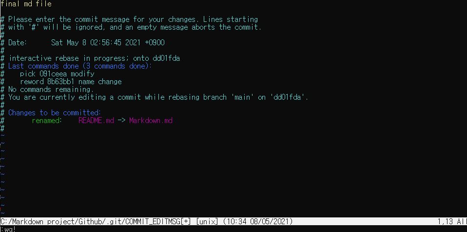 팀원들이 갱신된 파일을 확인을 해 본 후, 더이상 수정할 부분이 없다고 생각하여 올라와 있는 Markdown파일의 "name change"라고 메세지를 메세지를 "final md file" 라고 수정하기 위해서 rebase의 명령어를 사용했다.