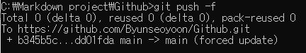 -f 옵션은 원격 저장소 내의 해당 브랜치의 코드 변경 이력을 로컬 저장소의 코드 변경 이력으로 덮어쓴다.